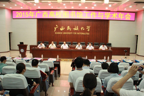 5月7日至8日, 2015年广西高校图书馆工作与学术年会在广西民族大学隆重举行,广西教育厅副厅长蔡昌卓,广西大学副校长毛汉领,广西民族大学副校长黄世喆、广西区图书馆馆长徐欣禄出席了会议。来自全区62所高校161位代表及20余位商家代表参加了此次年会。我馆黄昭彦馆长和蒙童慧副馆长应邀参加。