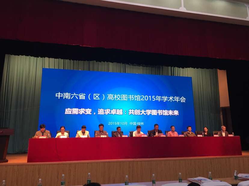2015年10月29-30日,由广西高校图工委承办的“中南六省(区)高校图书馆2015年学术年会在桂林隆重召开,本次年会以应需求变,追求卓越:共创大学图书馆的未来”为主题,对“大学图书馆在管理、服务、资源、空间、技术等方面的变革与创新”等问题进行了研讨,来自河南、湖北、湖南、广东、广西、海南六省高校图书馆代表300余同仁参加大会。我馆也派出代表参加了会议交流。