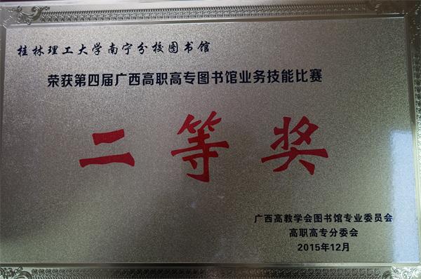 12月11日,2015年广西高教学会图书馆专业委员会高职高专分委会工作与学术年会暨第四届广西高职高专图书馆业务技能比赛颁奖典礼在广西南宁市天妃商务酒店举行。本次业务技能比赛的主题是 “践行图书馆学五定律,提升图书馆服务水平”案例大赛,大赛由广西高教学会图书馆专业委员会高职高专分委会主办,设一等奖2名、二等奖3名、三等奖5名及优秀奖若干名。经专家评审,我校图书馆的参赛作品“精准定位,灵动空间”脱颖而出,荣获二等奖。会议还安排获奖代表上台进行案例解析和经验交流。
