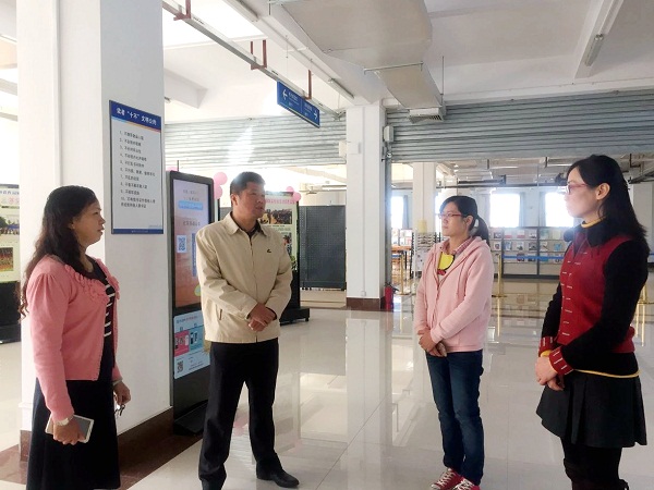 分校校长冯兵(左二)、副校长陈东莲(左一)在图书馆调研并指导工作
