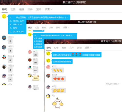 图书馆分工会开展线上知识竞答活动,竞答内容包括新型冠状病毒防治、图书馆业务知识和医疗保健知识的科普。分工会全员积极互动,踊跃答题,气氛十分热烈。通过线上互动活动的开展丰富了馆员在疫情期间的文化生活,加深馆员对疫情防控知识和本职业务知识的理解与学习,强化了馆员抗疫期间的尽职履责,主动担当意识。