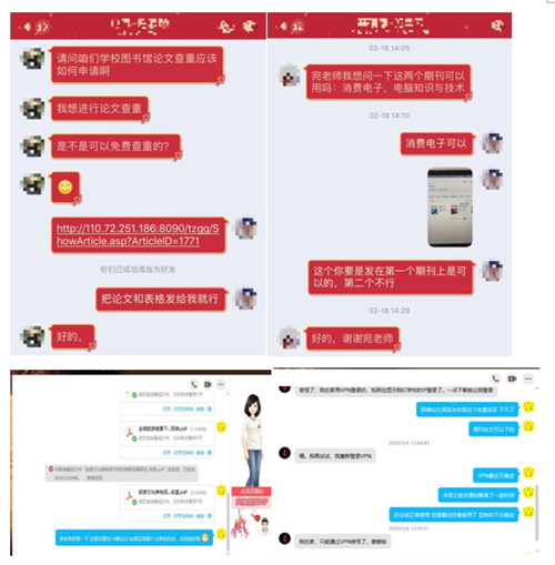 “闭馆不打烊、服务不打折”,图书馆在抗疫闭馆期间主动作为,全力保障信息服务平台和资源利用平台的正常运行,为线上资源的不间断访问、解决读者各项信息资源服务需求积极采取措施。如实行纸质图书逾期归还政策,开展教师论文检测审核工作,满足纸本图书紧急获取需求,提供论文下载文献传递服务,优化微信公众号24小时智能回复功能,通过QQ、微信、电话、邮箱等多种途径,回复解答读者咨询百余次。