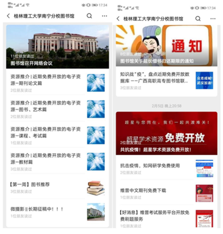 图书馆第一时间与各大出版社及数据库商积极沟通协调,整合电子资源数据库平台共33个,通过“桂林理工大学英国上市公司365图书馆”微信公众号、图书馆主页和qq群,微信群等多个渠道向师生读者们进行宣传推介,包括各类期刊论文、电子图书、教材教参,考试资料库,音视频资料库等,涉及领域宽泛,内容丰富,助力“停课不停学、停课不停教”,为学校的教学科研工作和学生学习提供资源保障。