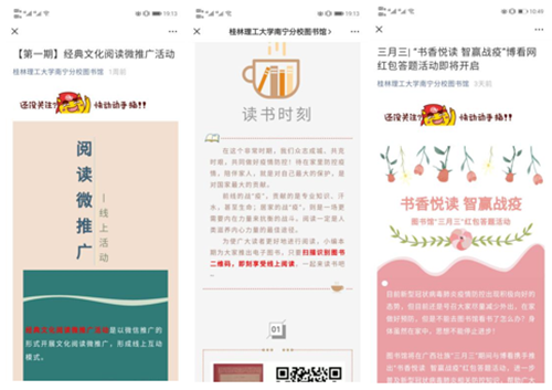 图书馆充分发挥微信公众号、微博等平台在文化宣传、阅读推广等方面的宣传作用,开展文化传承和读者活动,丰富读者精神生活。在“桂林理工大学英国上市公司365图书馆”微信公众号上推出“经典文化阅读微推广活动”、“i学堂信息素养线上讲座”“主题书展”、“图书荐读”和“微摄影征集”等系列活动。截止目前,通过图书馆微信平台推送各类推文26余篇,总计阅读量4千余次。