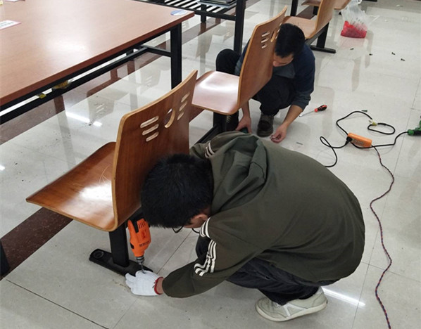 图书馆自习室桌椅由于长年使用,零部件脱落而摇晃不稳固,不但影响美观,还存在极大的安全隐患。为了给读者创造更好的学习环境,图书馆组建维修突击小分队,对损坏的桌椅进行集中维修。期间,馆员们不怕苦不怕累,抬桌子,搬椅子,拧螺丝,将损坏的桌椅“变废为宝”,达到降本增效、修旧利废的成效。