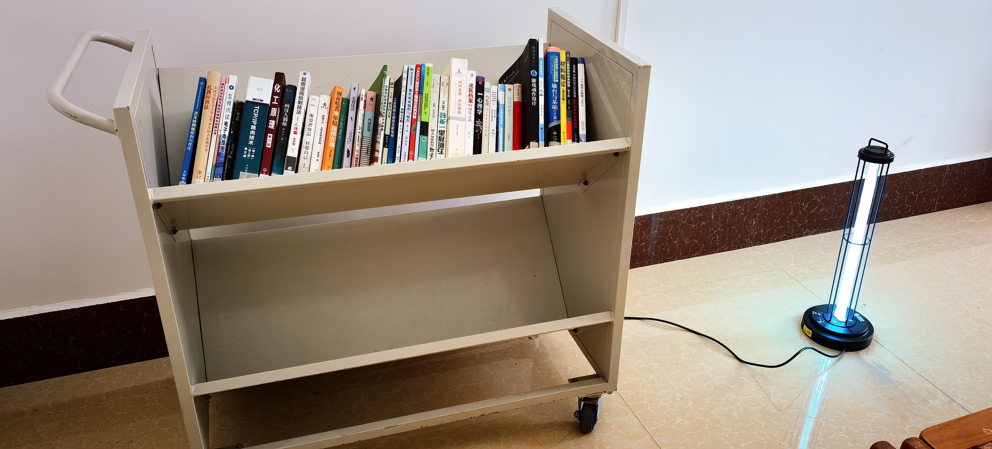 为了加强对馆内的卫生管理,严防疫情在馆内传播和蔓延,图书馆坚持每日定时开窗通风,开展3次常规喷洒消毒工作,使用消毒酒精对馆内公共区域、前台、自助借还机、电子阅读机、电梯、卫生间和阅览桌椅等处进行喷洒和擦拭消杀,并做好详细登记。读者日常归还的图书,统一进行紫外线消毒后方可上架,确保馆内所有空间和物体表面做到无死角消毒,保障卫生清洁消毒措施落实到位。同时,图书馆洗手间均配备含抑菌功能的清洁用品,可免费供读者使用。