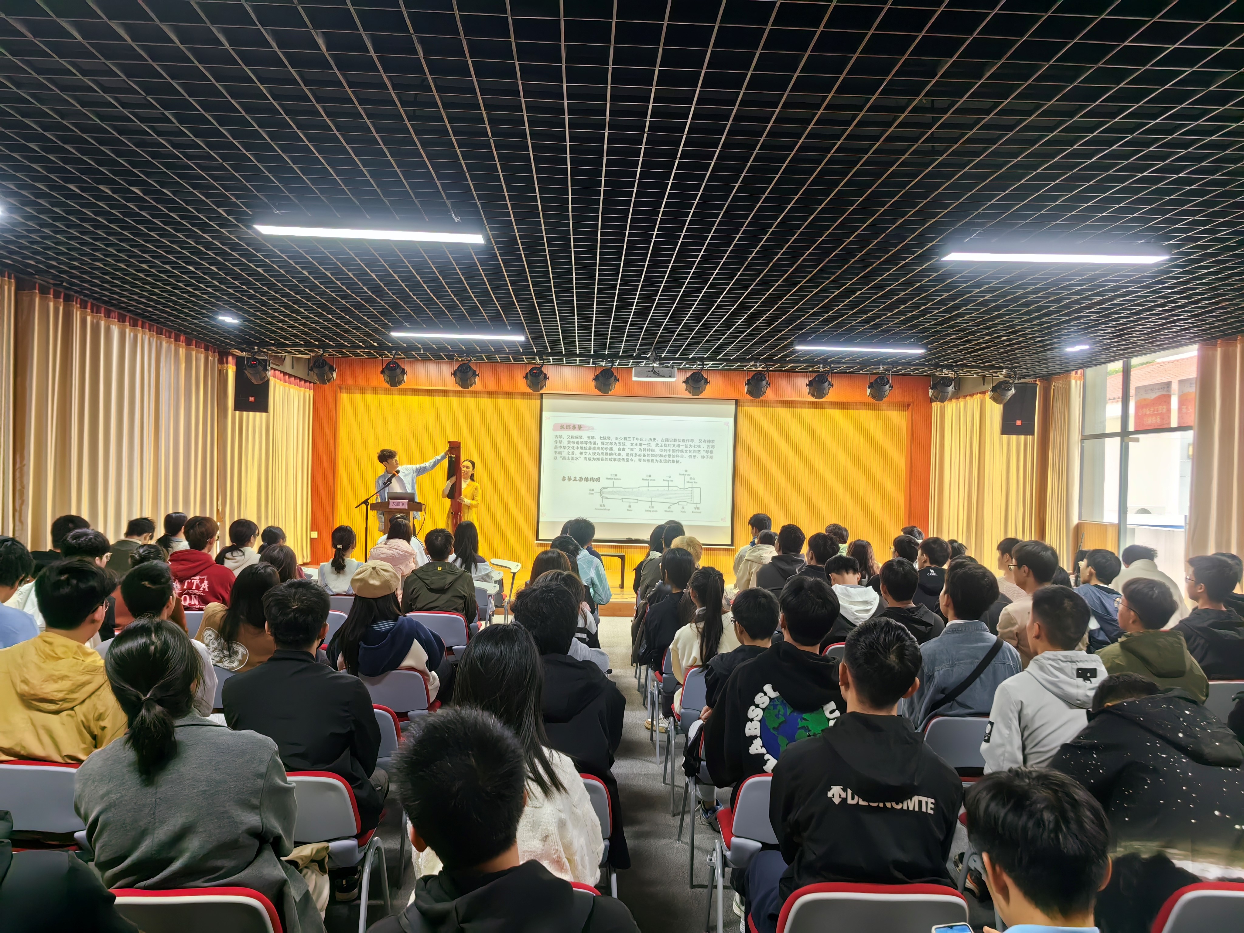 讲座中,艾鹏飞老师以其深厚的专业知识和热情的演讲风格,以“知琴、识琴、听琴”为主线图文并茂讲解了古琴的形制、历史和类别,特别介绍了几种著名的琴式和断纹的种类及其形成原因,不仅让同学们近距离感受到了古琴音乐的魅力,还深化了大家对这一传统艺术形式的理解和欣赏。