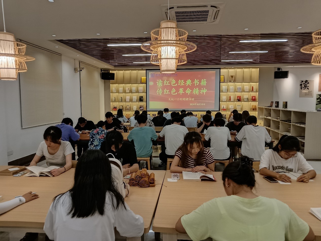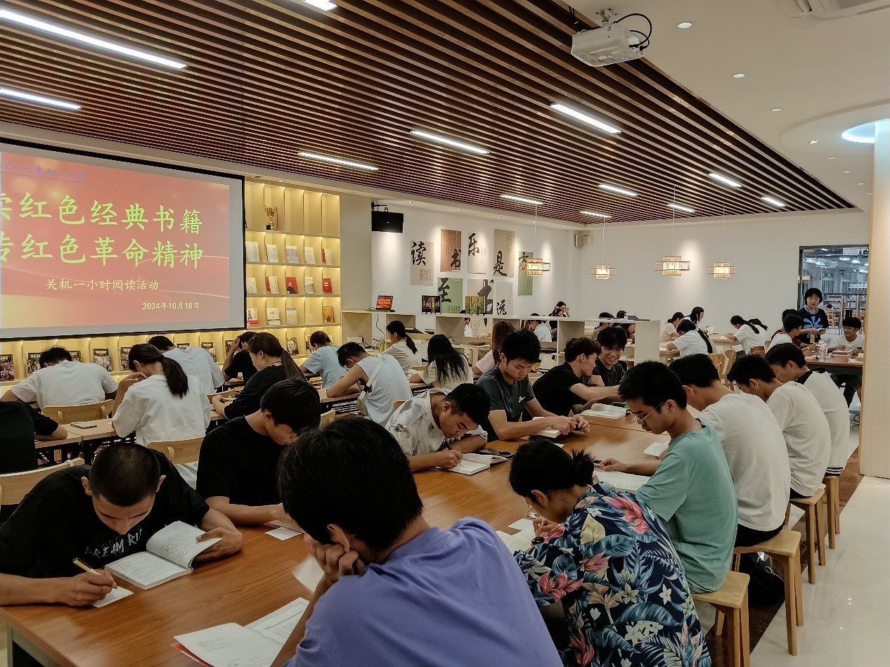 10月18日晚,图书馆在七楼阅享空间开展了第十二期“关机一小时”阅读活动,本期阅读主题为“读红色经典书籍,传红色革命精神”,活动吸引了约100名在校生参与。