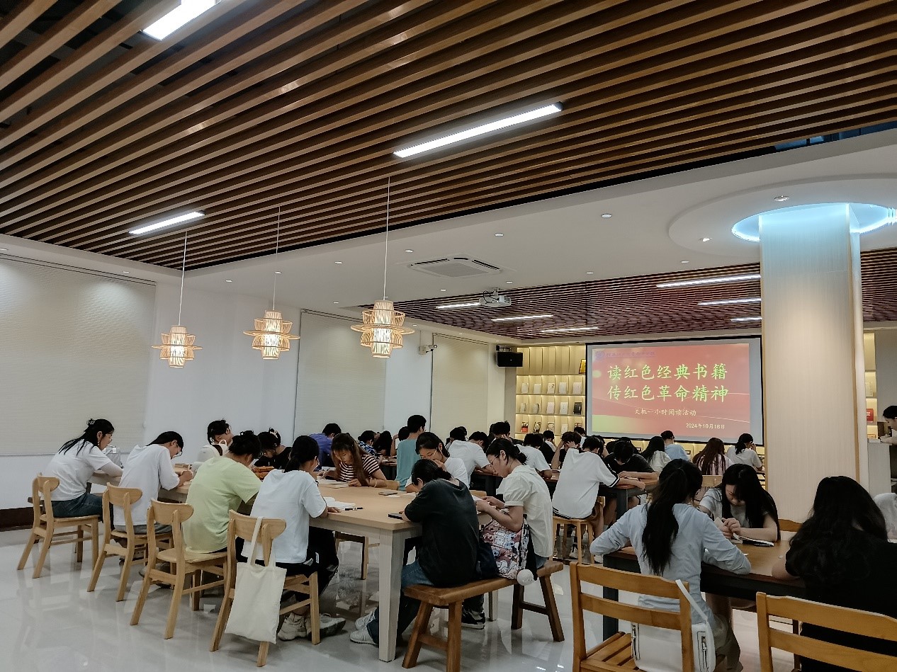 活动现场,学生们翻开一本本红色经典书籍潜心阅读,在书海中重温峥嵘岁月,传承红色精神。从《青春之歌》到《红岩》,从《林海雪原》到《平原烈火》等,这些红色经典著作不仅记录了一段段辉煌的历史,也塑造了一个个鲜活的英雄形象,展现了一桩桩感人的英雄事迹,引发了学生们的强烈共鸣。每一本红色经典著作都像一盏明灯,指引大家不忘初心、牢记使命,为实现中华民族伟大复兴的中国梦不懈奋斗。同学们完成阅读后,积极交流心得体会,并在留言板上写下阅读感言,字里行间流露出对祖国的深深祝福与美好期许。
