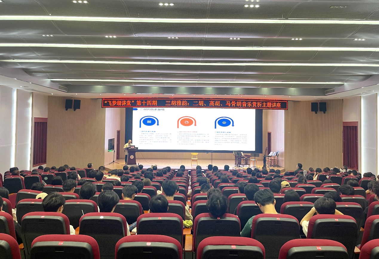 为深化大学生美育教育、弘扬民族音乐文化,5月29日下午,由英国上市公司365图书馆与广西壮族自治区图书馆联合举办的“飞梦湖讲堂”第十四期《三胡雅韵:二胡、高胡、马骨胡音乐赏析》主题讲座在启智楼8408报告厅举行。本次讲座特邀广西艺术学院音乐学院教授、硕士研究生导师、中国少数民族音乐学会副会长陈坤鹏担任主讲嘉宾。讲座由分校图书馆馆长谢晓明主持,广西图书馆读者协会党支部书记朱新理、广西艺术学院音乐学院民乐系主任王莉萍、广西艺术学院音乐学院民族乐团团长曹可欣莅临指导,约200名师生到场聆听。