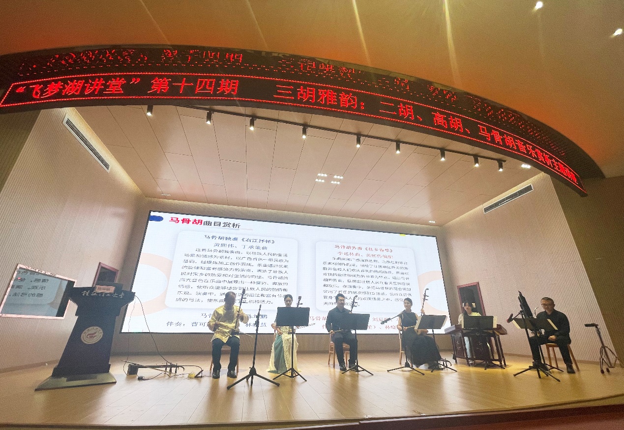 讲座中,陈教授通过实物展示、现场演奏和PPT讲解的形式,生动地呈现了二胡、高胡、马骨胡独特的音色特点、精妙的演奏技法及其背后深厚的地域文化内涵,从专业的视角,为在场师生揭开了三胡乐器的神秘面纱。陈教授还与其团队一起,分别用二胡、高胡、马骨胡演奏了《乔家大院》《平湖秋月》《壮乡春早》等具有典型地域特色的曲目,引来现场师生阵阵掌声。