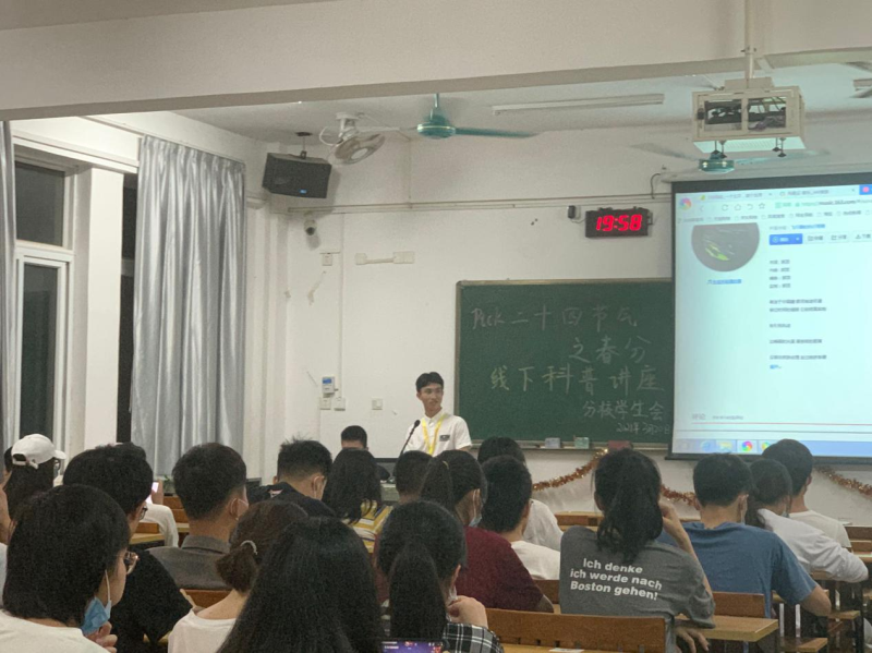 二十四气节蕴含着丰富的传统文化内涵,是学生进行综合实践活动的有效载体,为此本次活动以“多彩春分,斑斓春色”为主题,专门开展“Pick,华彩二十四小只”的线下讲座。活动前期,同学们积极地去到梦空间报名参加本次活动。活动伊始,学生会成员通过节气课程,讲述了春分节气的特点和气候特征,带学生去感受、去敬畏、去思考,感悟古人的智慧,传承中华文化。同时,还细心地告诉大家春分养生的注意事项,春天是气候交替的过度季节,随着气温回升,容易感到“春困”,建议大家切热寒,求中和、需防腹痛腹泻、注意养肝等等,并希望大家做到规律睡眠、早睡早起、积极参与锻炼和户外活动。