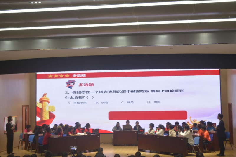 此次活动以竞赛的形式展开,参赛题型包含必答题和抢答题。在团队必答题过程中,各队激烈角逐。各队在抢答题时,士气高昂、团结协作,展开了一场势均力敌的知识较量,显现出各队成员对民族团结知识有着深入的了解。比赛中,各个参赛团队通过强大的记忆来掌握知识,以各自的实力展现各自的才华能力。除此之外,此次竞赛活动还设计了观众互动环节,现场观看竞赛的同学积极参与且互动抢答关于民族团结的相关知识,现场气氛十分活跃。最后,冶金系、土木系、电气系分别荣获冠军、亚军、季军,出席活动的领导为获得奖项的团队颁发奖金,三个系按排名依次获得500元、400元、300元的奖金,此次竞赛活动圆满结束。