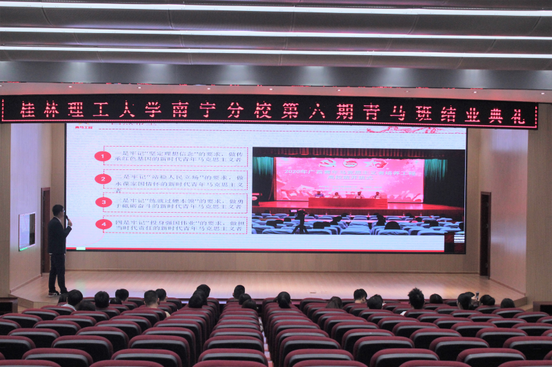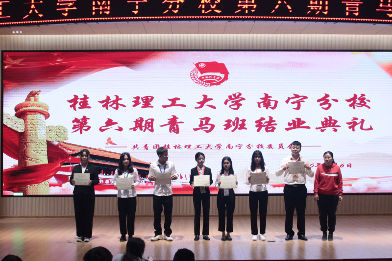 典礼上,2020年广西区“青马班”学员代表胡杨春同学进行了学习成果汇报,并号召大家珍惜学习机会,争做德才兼备的学生干部,积极参与实践活动,成长为中国特色社会主义事业的合格建设者和可靠接班人。分校团委书记黄薇薇为第六期“青马班“顺利结业学员代表颁发了证书。