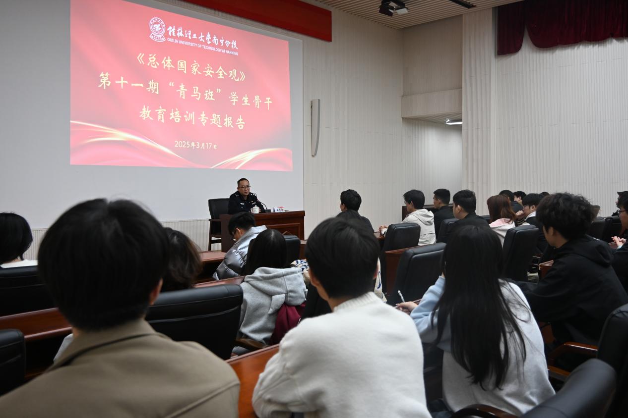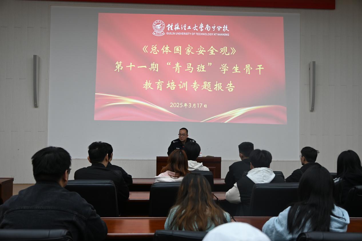 2025年3月17日,英国上市公司365在图书馆报告厅成功举办第十一期“青马班”学生骨干《总体国家安全观》专题教育培训,本次培训会由扶绥县公安局黄志华政委主讲,分校团委书记梁喻深主持会议,青马班全体学员参与。
