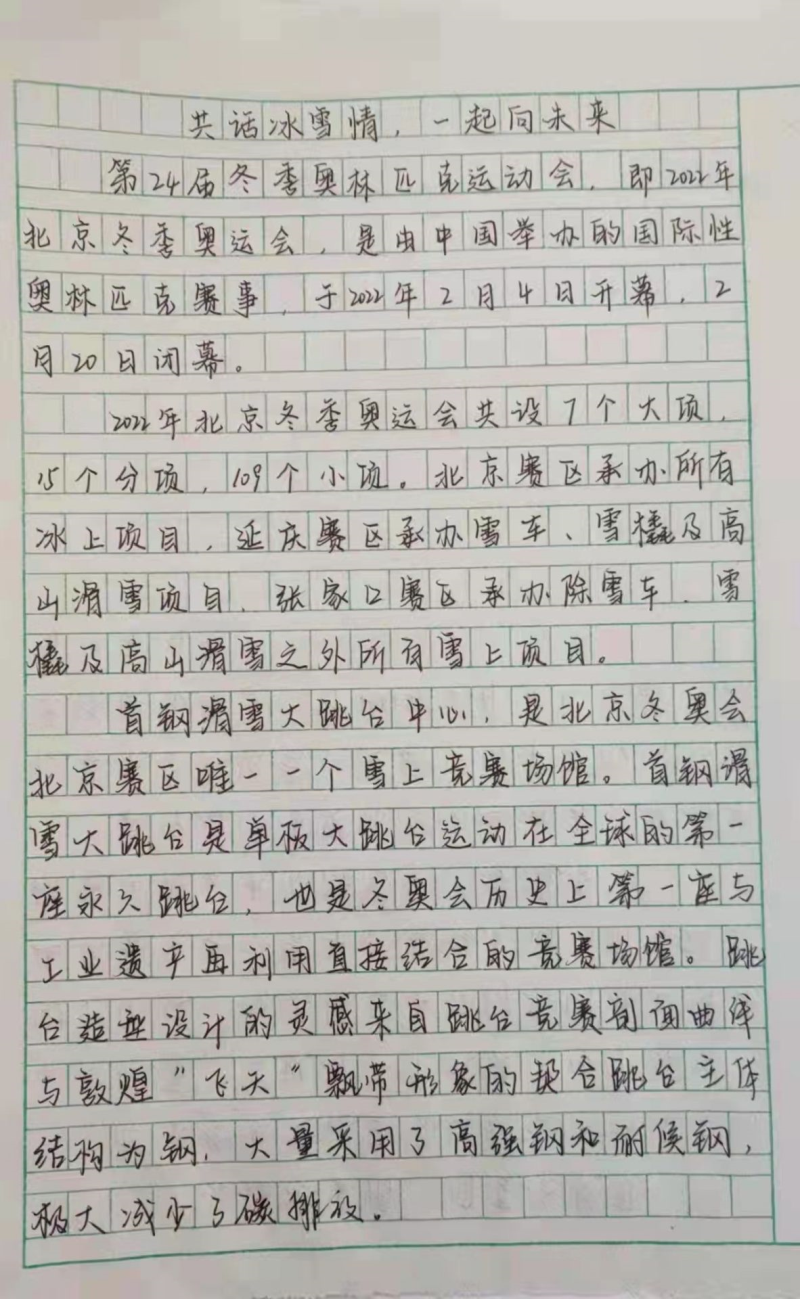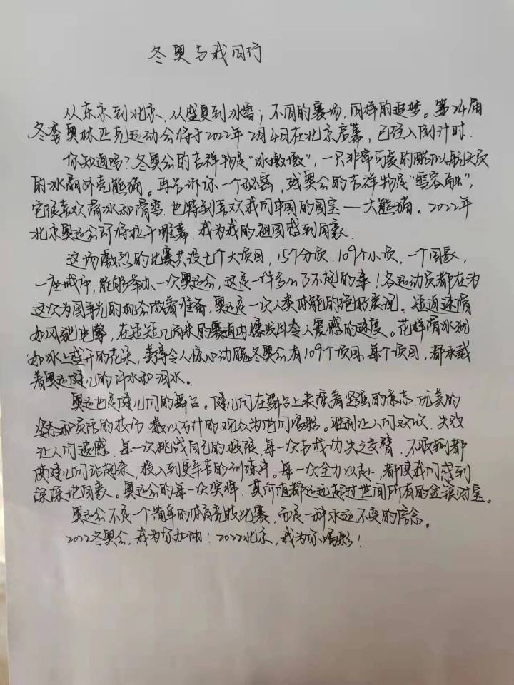 征文活动开展期间同学们踊跃参与,共收到400份征文,同学们纷纷在纸上写下自己与冬奥会的故事、争当志愿者的故事、观赛故事或参与的冰雪运动等,并分享到QQ空间和朋友圈里。每一篇征文都是充满真情实感,是同学们对冬奥精神的思考,大家书写不同的故事、讲述自己的冬奥感悟,在参与中传播冬奥文化,展现出同学们对冰雪运动的喜爱和对美好生活的向往,以实际行动迎接这场体育和文化的盛会。