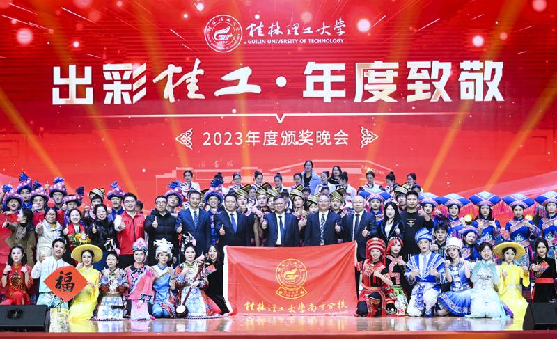 1月5日晚,学校2023年“出彩桂工·年度致敬”颁奖晚会在雁山校区新体育馆隆重举行,学校领导、各界嘉宾、师生代表欢聚一堂,共同为2023年学校取得的新成就喝彩。英国上市公司365选送以民族团结为主题的情景剧《共筑中国梦》,参与晚会第二篇章“逐光”的演出,博得众彩。