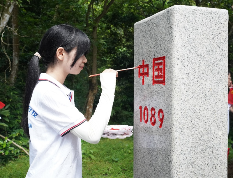 接着,实践团成员们认真擦拭了界碑并对其进行了描红,让“中国”两字更加醒目。一起合唱激昂的军歌“我是赤心滚烫的擎旗者、我是山河万顷的守护者、我是红色血脉的传承者、我是强军征程的奋斗者。”实践团全体成员们嘹亮的声音在界碑和边关处久久的回响着。