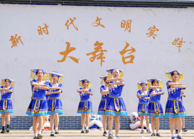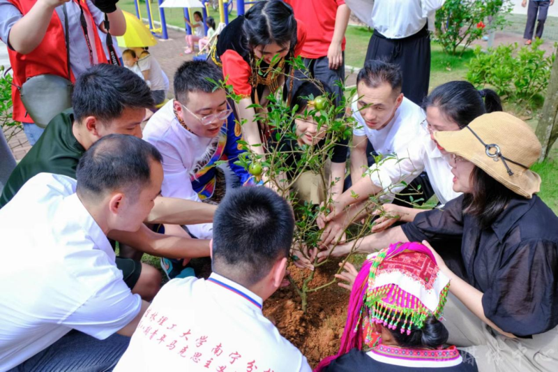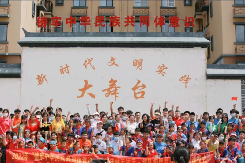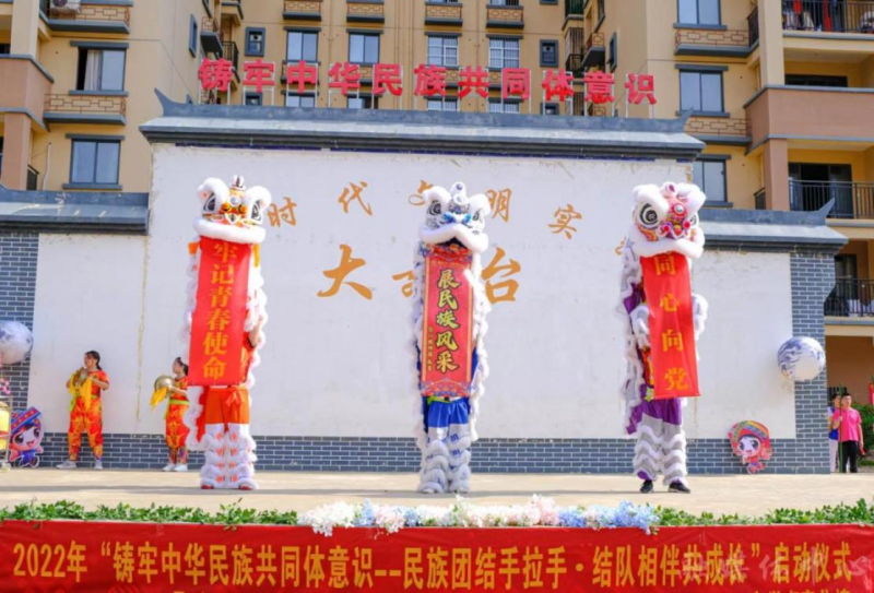 活动在民族传统技艺舞狮子中拉开帷幕。精彩的民族舞蹈节目串烧表演,赢得在场人员阵阵欢呼;民族趣味互动小游戏以一对一地进行交换卡片和小礼物拉近彼此间的距离;在同印一幅中国地图画中,来自新疆、内蒙的大学生代表等与结队少先队员纷纷按上自己的手印,讲述爱家乡的故事;来自维吾尔族、蒙古族、瑶族、壮族、仫佬族等高校老师、大学生、团县委同志与安置点苗族、壮族等小朋友一起种下石榴树,同心共筑中国梦;活动在同唱《爱我中华》中达到高潮。