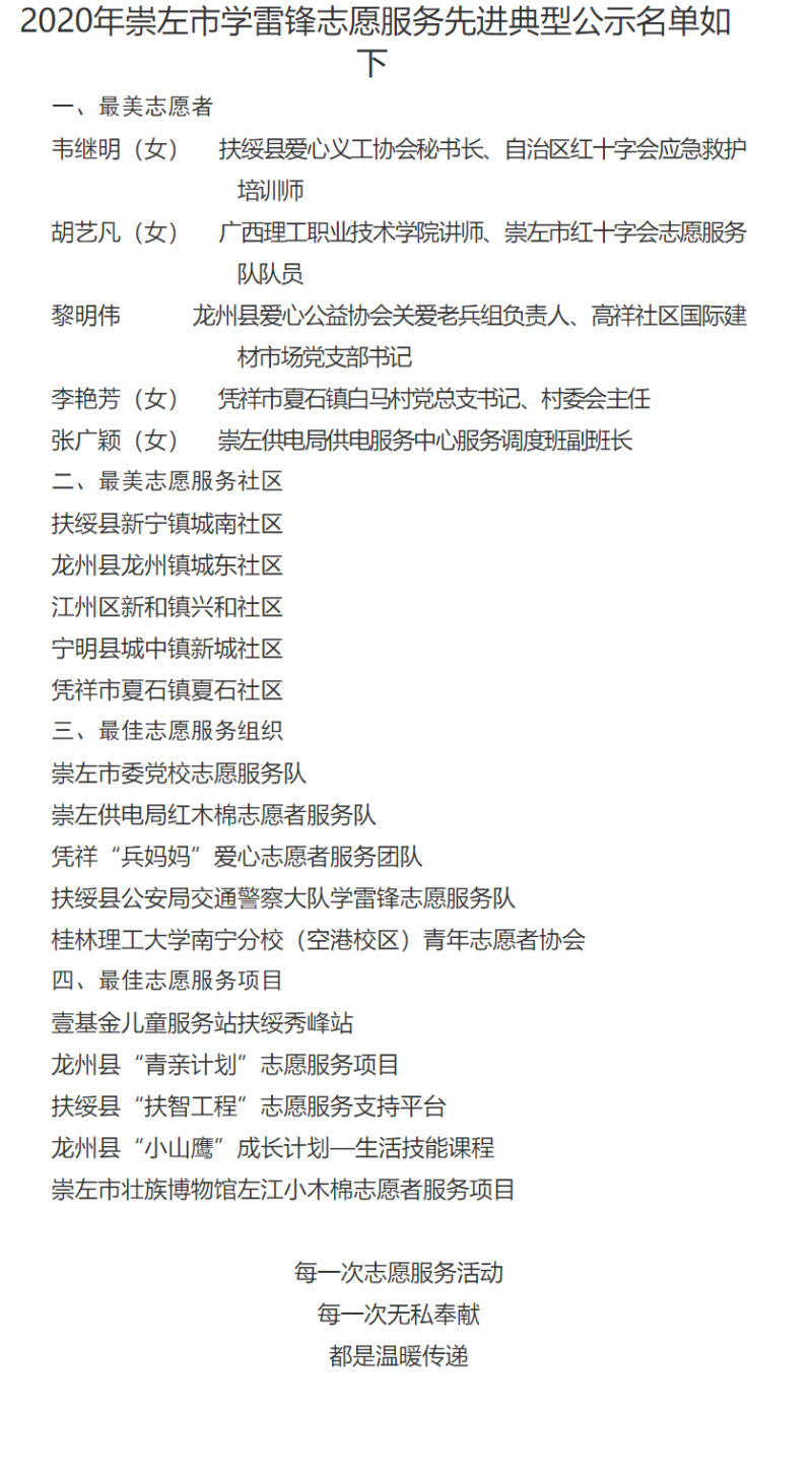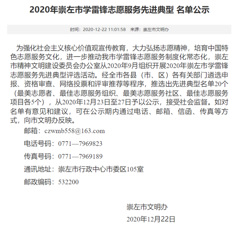 为深入贯彻落实习近平新时代中国特色社会主义思想,贯彻落实国务院《志愿服务条例》《广西壮族自治区志愿服务条例》,积极培育和践行社会主义核心价值观,大力弘扬“奉献、友爱、互助、进步”的志愿精神,进一步推动学雷锋志愿服务制度化常态化,崇左市精神文明建设委员会办公室于9月至11月组织开展了2020年崇左市学雷锋志愿服务先进典型评选活动。其中,英国上市公司365“《扶智工程》志愿服务支持平台”荣获崇左市颁发的“最佳志愿服务项目”称号;桂林理工大学英国上市公司365青年志愿者协会荣获“最佳志愿者组织”称号。