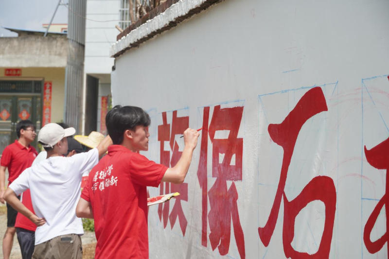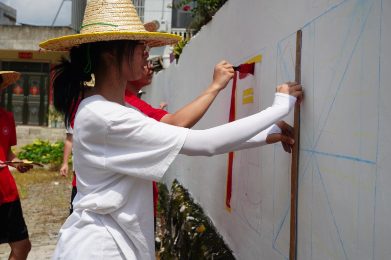 在渠黎镇弄平村,实践团成员以当地民俗文化为创作主题,融入民间风俗、农耕文化、饮食文化等元素进行墙绘创作,展示了各族人民日常生产生活情景,增添了村庄的文化元素,美化了周边环境,促进民族文化向乡村覆盖,精神文明向乡村传播,营造了民族团结一家亲的浓厚氛围。面对七月骄阳似火的天气,实践团成员毫不畏惧,弯腰、抬臂、起手、落笔、上色 ,画笔在光影间跳跃,他们的身影成为弄平村一道亮丽的风景线。