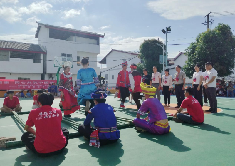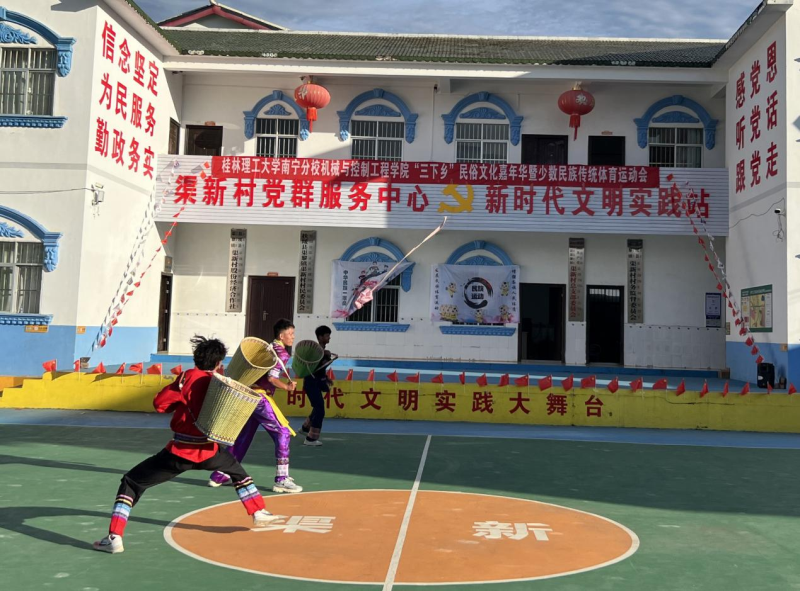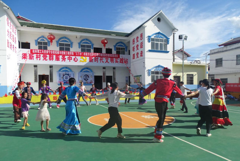 在全国文明村渠黎镇渠新村,实践团举办了“民族文化进乡村 中华民族一家亲”民俗文化嘉年华暨少数民族传统体育运动会,把民族优秀传统文化送到群众身边。民俗文化嘉年华在《壮酒歌》旋律中拉开序幕,赠绣球、拦门茶、敲锣鼓、高山流水、竹竿舞等民俗仪式让在场群众沉浸式体验了极具特色的少数民族文化魅力。现场还进行了山歌对唱、民族舞蹈、广西12个世居民族服装秀等节目表演,赢得了观众的阵阵掌声。五色糯米饭、油茶等民族美食让在场群众回味无穷。少数民族传统体育运动会开展了背篓绣球、板鞋竞速、踢毽球、踩高跷、滚铁环等多个竞技项目,吸引了在场各族群众的踊跃参与,比赛过程中大家团结协作、其乐融融,展示了少数民族传统运动的风采,唱响了团结奋斗的主旋律。