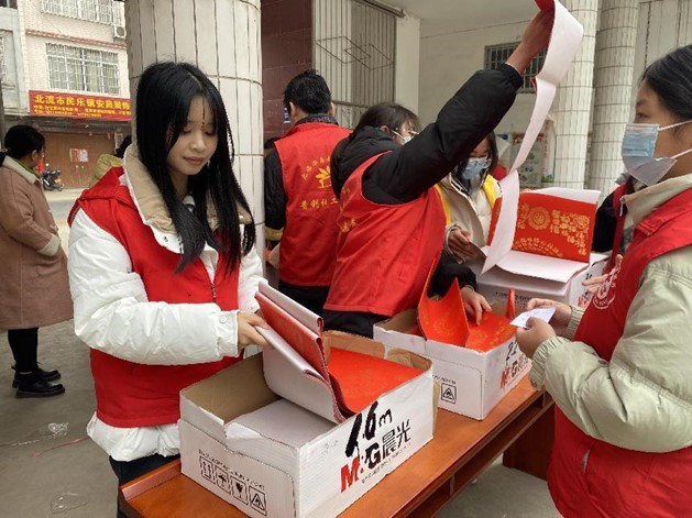 财管23-本1班吴玉婷同学在北流市民乐村参加了本地各个村的“迎新春送春联公益活动”,通过维持现场秩序,辅助书法老师写对联、晾对联、分发对联等方式,让她在这次活动中感受到了中国毛笔书法的魅力,深刻体会到奉献和分享的快乐,激发了对中国传统文化的热爱和作为新时代青年肩上的责任感和使命感。