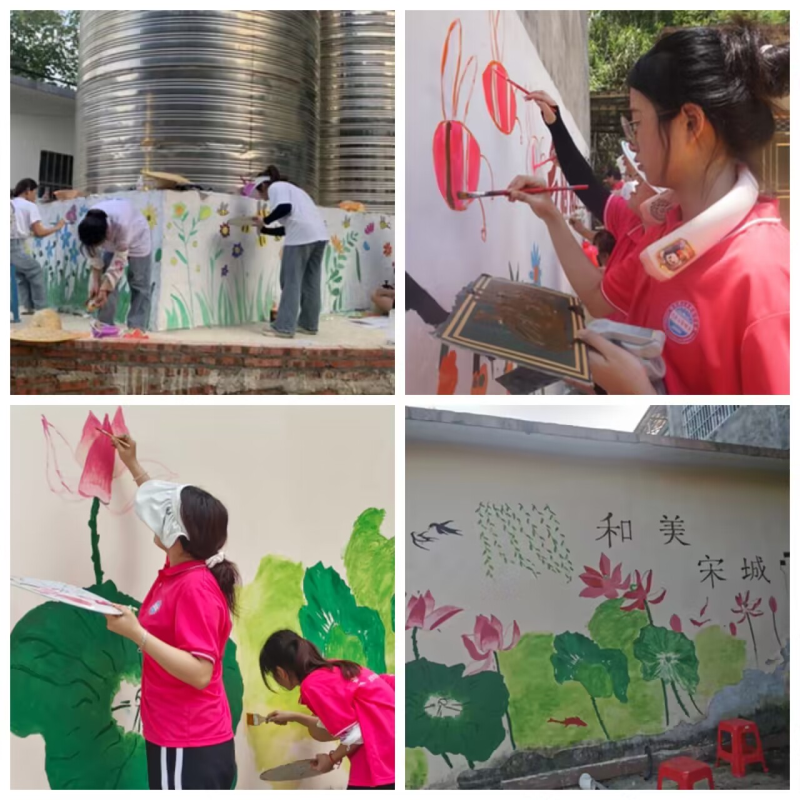 画笔相约,躬行夏日。“乡村振兴”队积极组织开展义务墙绘活动。在绘制过程中,志愿者们克服高温天气,手托颜料,一勾一点、一笔一画,以墙体为画卷,全神贯注,以工匠之心追求完美。志愿者们既对脱落的墙体进行修补绘制,同时依托墙绘进行文化宣传,化破败墙体为生动画卷,赋予了白墙生命的气息。志愿者通过美化居住环境,一举两得,得到了村民们的赞美与认同。在建设乡风文明、生态宜居的美丽乡村进程中发挥重要作用。