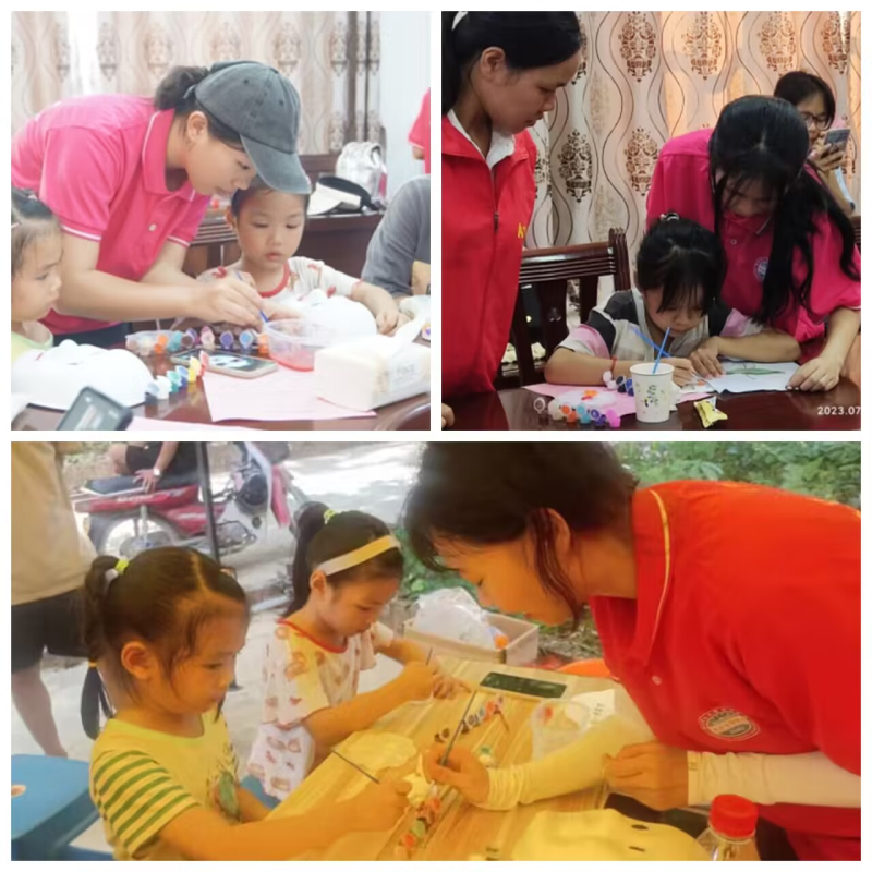 为积极促进教育下乡,推进乡村振兴教育,志愿服务队和当地的村委工作人开展了以“七彩假期,情暖童心”为主题的活动。活动过程中,志愿者通过美育教学课堂,利用石膏画、面具画、扇子画等形式多样的教学内容,对小朋友们进行美育教育,引导小朋友们探索生活中的美,使小朋友们更直观地领悟到美术之“美”。