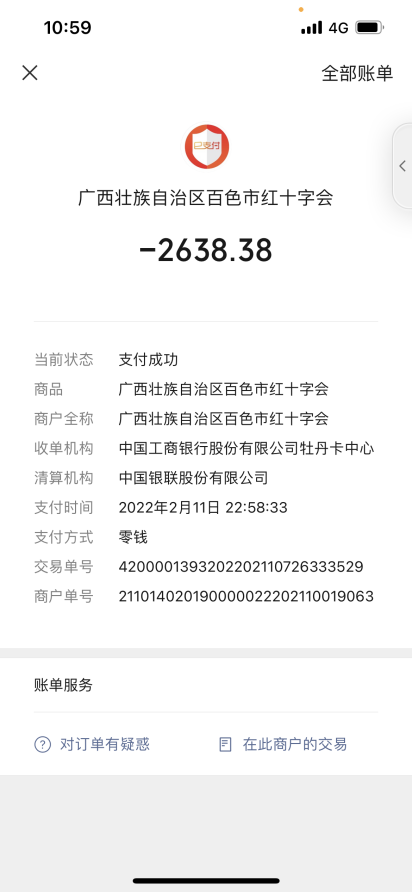 (募捐钱款向广西壮族自治区百色市红十字会转账部分截图)