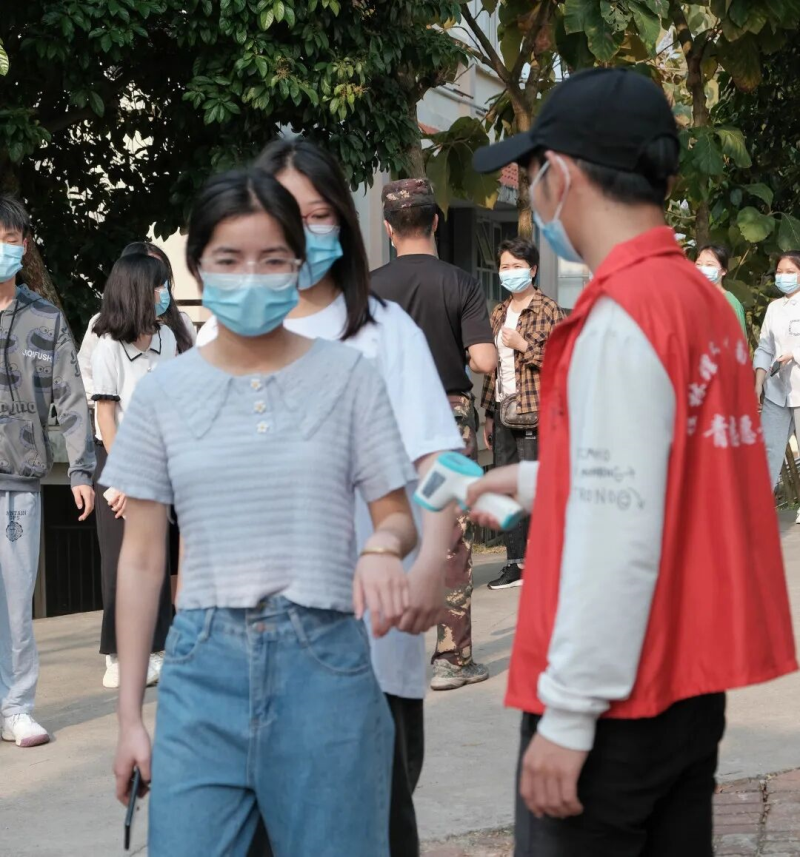 志愿者帮助测量体温和维持秩序