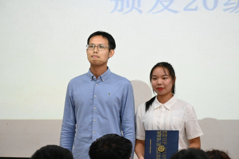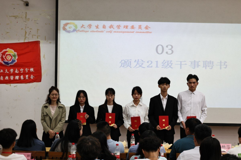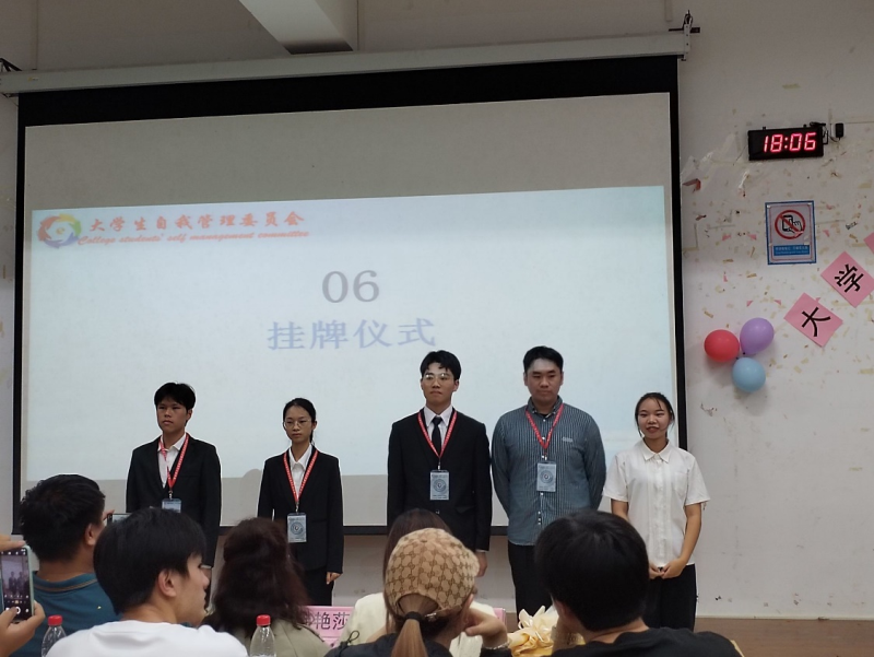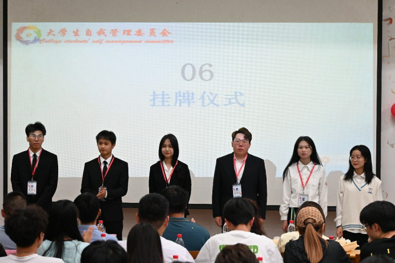 大会伊始,全体成员集体奏唱国歌,观看换届视频;指导老师分别为第十一届干事和第十届委员代表颁发聘书,章丰慧老师宣读自管委第十一届委员任命名单;随后第十届委员为第十一届委员挂牌,挂牌仪式象征着责任的交接,挂牌后,主席团代表举行旗帜交接仪式;紧接着新任主席刘灿进行就任发言,表示在接下来的工作中会更加努力,与大家齐心协力,团结协作,推动自管委绽放出更加夺目的光芒。