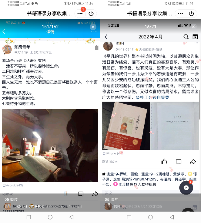 本次活动以行走之“书”、书籍语录分享、短视频朗诵、绘制书签四种形式开展。活动前期共有602人参加行走之“书”,1000人参加书籍分享,698人参加短视频朗诵,750人参加绘制书签。活动结束后,绘制书签有罗敏仪等13人获得一等奖,覃晓丽等25人获得二等奖,卢应红等42人获得三等奖。点滴的脚步走出心中的“书”;清爽的朗诵声抒发书中之情;语录的分享,汇聚不同的感悟;书签的制作,那是同学们对书籍的热爱。