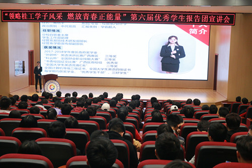领略桂工学子风采,燃放青春正能量。3月26日下午由分校学生工作部主办、大学生自我管理委员会承办的第六届优秀学生报告团宣讲会在启智楼8408教室顺利举办。
