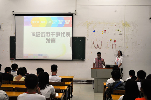 会上,首先由主席团代表蔡鹏介绍大学生自我管理委员会的价值观和职能,强调了大学生自我管理委员会的传统精神。接着由各中心代表发言,各中心代表首先热情的欢迎各位新成员的加入,并做出本中心上学期的工作总结以及未来工作计划。紧接着由试用干事代表发言,试用干事代表展示了自己加入自管委的决心,且鼓励各位新成员要加强与大家的交流,尽早融入集体中来。