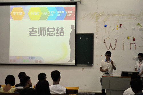 会议最后,由指导老师曾灿博老师做总结,他向16级新成员解释了大学生自我管理委员会Logo的含义,并肯定了16级新成员的选择,再以历届学长学姐成功的例子来激励新成员能够在这个团体自我管理、自我服务、自我成长,做一个成功的人。