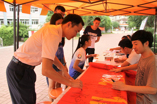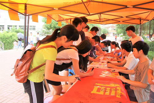 7月4日早,大学生自我管理委员会学风建设中心干事黄晗宇在国旗下进行了“诚信考试,诚实做人”的倡议,有效的对全校师生进行了诚信考试的宣传与呼吁。并以此拉开了“诚信考试宣传周”的帷幕。此外,7月7日中午,大学生自我管理委员会学风建设中心举办了以“诚信考试,诚实做人”为主题的宣传活动。活动现场气氛热烈,同学们积极参与横幅承诺签名,并在心愿墙写下了自己的考试心愿。值得一提的是,学工部副主任罗勇老师也参与了此次活动,在横幅上签名并写对同学们的美好祝愿贴于心愿墙上,鼓励和呼吁广大同学做到诚信考试。
