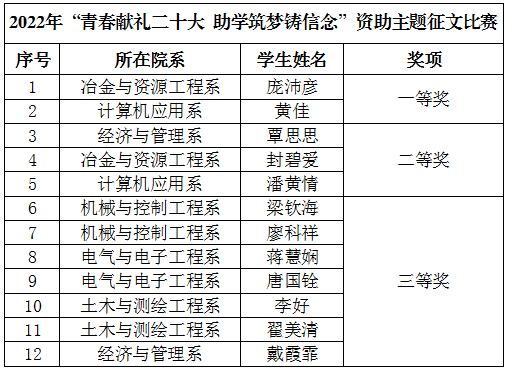 为进一步加大学生资助政策宣传力度,贯彻落实《全国学生资助管理中心2022年工作要点》和《2022年广西学生资助工作要点》精神,积极营造喜迎党的二十大的浓厚氛围,确保国家学生资助政策家喻户晓、深入人心,激励分校受助学生奋发图强、立志成才,结合2022年全区“学生资助政策宣传月”活动安排,决定在分校开展“青春献礼二十大 助学筑梦铸信念”资助主题征文比赛,经系部推荐,学工部评审,现就获奖名单公布如下: