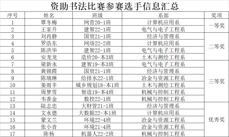 为深入学习贯彻党的二十大、全国两会和全国教育工作会议精神,贯彻落实全国学生资助管理中心《2023年学生资助工作要点》精神,大力宣传国家资助政策及成效,讲好中国学生资助故事,进一步激励分校受助学生奋发图强、立志成才。结合2023年学校“资助育人文化节”活动安排,决定在分校开展“青春筑梦新时代 资助伴我向未来”资助主题书法比赛,经系部推荐,学生工作部评审,现就获奖名单公布如下:
