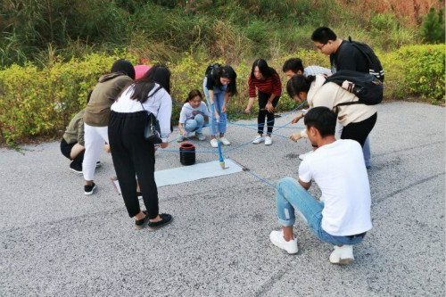 室内讲座结束后,两位老师带领全体心理委员到后山篮球场进行团体心理活动体验。活动分为“团队构建”、“有轨电车”、“神笔马良”、“讨论分享”四部分。各队在团队构建中,分别展示了本队的队名、口号、队歌及团队LOGO。随后,各队投入到激烈的活动环节,体会着活动的乐趣。同学们在游戏中互相协作,切身体会到了良好的沟通对团结合作的重要性。最后,大家分享了活动感受,回味游戏的同时,对班级团体构建有了更深入的了解,进一步理解了开展班级心理活动的意义。