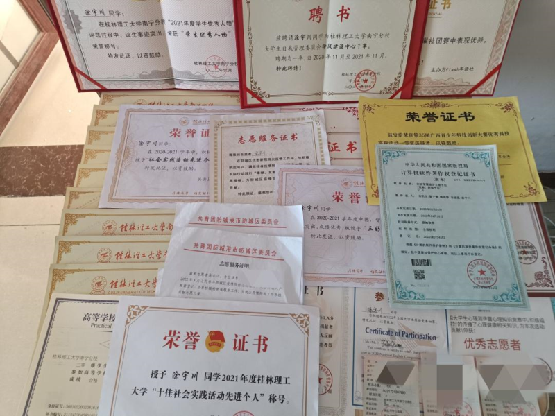 他曾获全国大学生英语能力竞赛“优秀奖”、数据库管理职业技能证书、鲲鹏云实训证书;在5·25心理健康节“心理知识竞赛”、“垃圾分类知识竞赛”中荣获三等奖。他的作品《高处不胜寒》获得防城港市青少年科技创新大赛青少年科普竞赛三等奖。