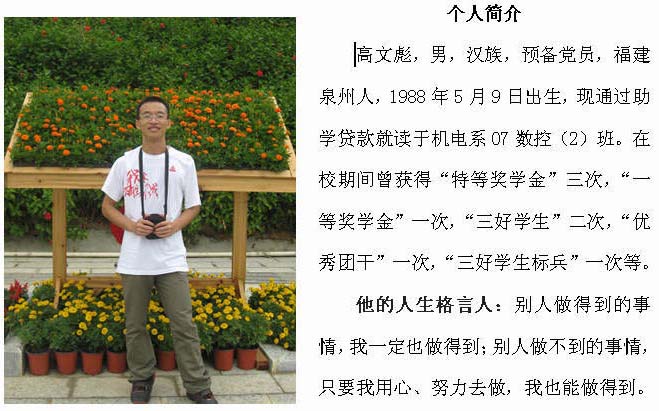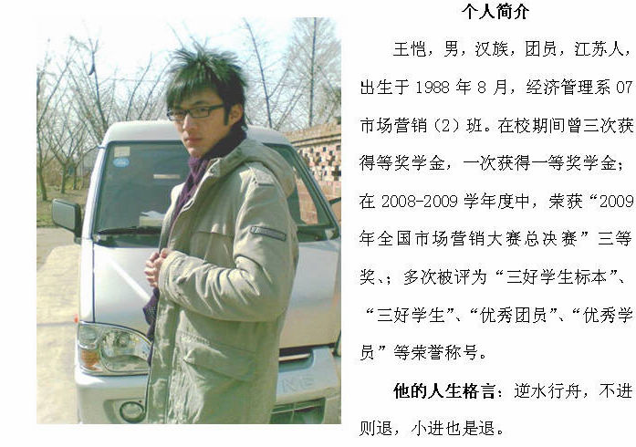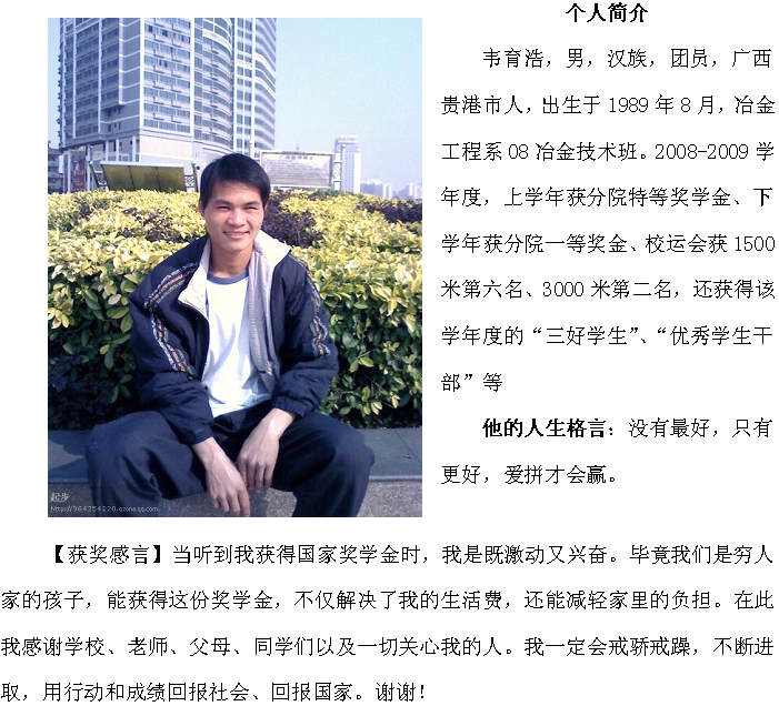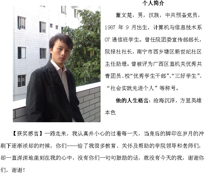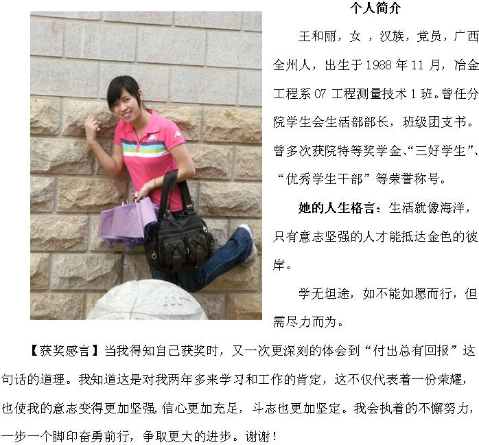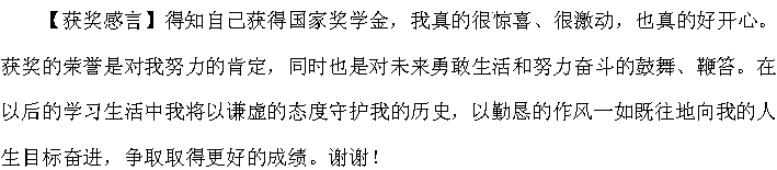 【获奖感言】首先要感谢学校,给了我这次申请该奖学金的机会,我还要感谢所有关心我的亲人,是他们的关怀和帮助,我才能走到现在。能拿到这个奖项,说明我是优秀的,但是我不会因此慢下我奋斗的脚步,我会继续努力,在各个方面做得更好。