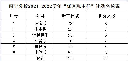 1、“优秀班主任”的评选按照规定名额由各系评审上报产生,上报学生工作部前须进行系内公示,最终名单由分校学生工作领导小组审核确定。