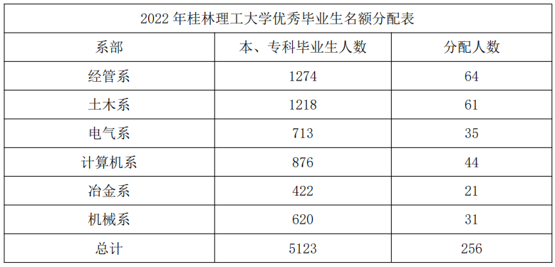 评选优秀大学毕业生是树立先进典型,充分发挥榜样的教育和示范作用,激励全校学生刻苦学习、全面发展、成人成才的一项重要措施。根据《桂林理工大学学生评优奖励办法》(桂理工学[2017]38号)文件精神,经研究,决定开展桂林理工大学2022年校级优秀毕业生的评选工作,现将有关事宜通知如下: