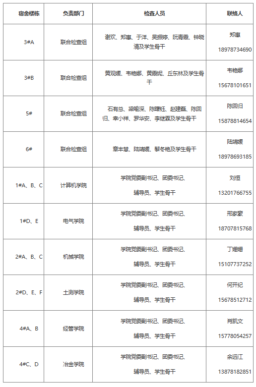 学工部(办)与团委、后勤部、保卫部、各学院开展联合抽查,具体安排如下。