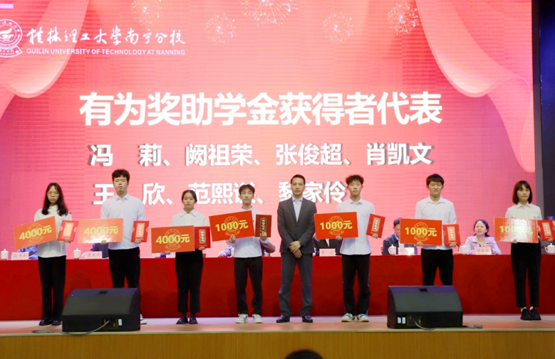 2004届校友、广西国邦志成科技有限公司总经理黄真强(右四)为“有为奖助学金”获得者代表颁奖