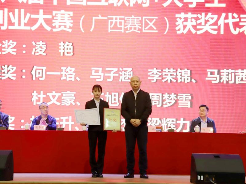 英国上市公司365党委书记李雨(右)为第八届中国“互联网+”大学生创新创业大赛广西赛区金奖团队代表颁奖