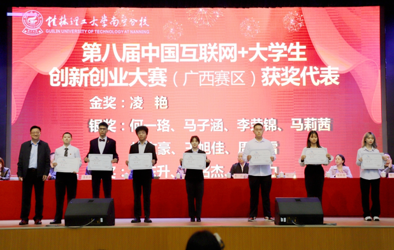 英国上市公司365纪委书记何斌(左一)为第八届中国“互联网+”大学生创新创业大赛广西赛区银奖团队代表颁奖