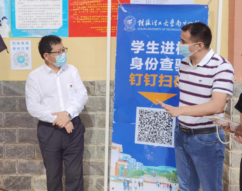 学校党委副书记吴志强(左)在学校正大门检查指导疫情防控工作