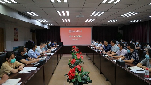 最后,周国桥书记对疫情防控以来学工系统所做的工作给予了充分肯定,对全体学工干部的辛苦付出表示衷心的感谢。他指出,自疫情暴发以来,学生系统认真贯彻落实学校部署要求,扎实做好学生信息统计、思想引导、心理疏导、宣传教育、返校筹备等工作,为学校疫情防控工作做出了重要的贡献。他强调,一是认清形势,增强责任感和使命感。要认清学生工作形势,认清当前疫情防控依然紧迫严峻的形势,提高工作责任心,克服麻痹侥幸心理,做实做细疫情防控期间学生思想政治工作;二是转变思维,加强学习,提升学生工作本领。新形势对学生工作提出了新的更高的要求,全体学工干部要持续加强学习,更新工作理念,守好责任田,为维护学校安全稳定工作贡献学工人的力量。